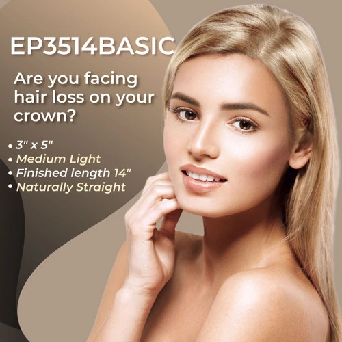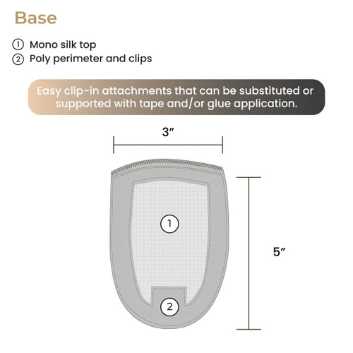 The EP3514BSC has easy clip-in attachments that can be substituted or supported with tape and/or glue application. With a base of 3×5 inches, its design can be used to easily integrate your own hair into the piece.