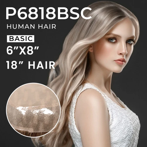 The P6818 Basic is a more affordable version of the P6818 women’s top piece. Similarly to the regular model, it uses a double monofilament center and comes with a 1/8″ double folded welded monofilament lace front which contributes to its invisible and extremely natural-looking hairline. Additionally, the clear glass silk poly perimeter provides the same attachment options ranging from glue, tape or clips while adding to the durability of the hair topper’s durability and allowing the top piece to be attached with glue, tape or clips. While not the same exact quality and durability as the P6818, it’s a great option for those who want to save a little money with virtually the same features.