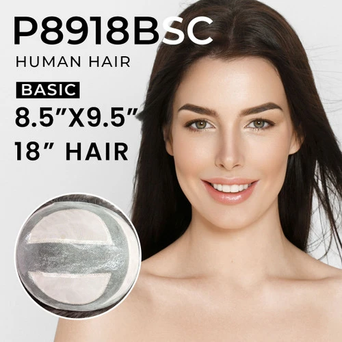 The P8918BSC is the Basic version of our regular P8918 monofilament poly skin hair topper. It comes in a larger but adjustable size of 8.5”X9.5” making it ideal for those with a larger area or level of balding and hair loss. It is constructed with a double monofilament design for comfortable wearing while the poly material aids in this top piece having a medium to long durability. Overall, it’s a great option for women dealing with extreme hair loss who want a hairpiece at a more affordable price!
